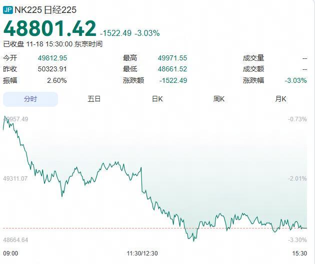 日经225指数收盘跌破49000点(在线图)财经通讯社报道,11月18日,日经225指数收盘上涨3.22%,创4月份以来最大单日跌幅,报48702.98点;韩国综合股价指数收盘上涨3.32%,报3,953.62点。 特别声明:以上内容(如有则包括照片或视频)由自媒体平台“网易号”用户上传发布。本平台仅提供信息存储服务。 注:以上内容(包括图片和视频,如有)由网易HAO用户上传发布,网易HAO为社交媒体平台,仅提供信息存储服务。