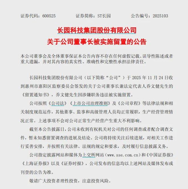 圣长源董事长、法定代表人乔文建因涉嫌违法被拘留,这给陷入管理困境的圣长源又增添了一个变数。 80后董事长11月24日深夜被捕。圣昌源公告称,公司当天收到惠州市惠阳区监委发出的关于公司董事长、法定代表人乔文健的“留置通知书”。乔文健因涉嫌玩忽职守被判入狱。公告还透露,截至目前,公司尚未收到公司主管部门的任何调查文件或配合,尚不清楚Lien调查的进展和结论。此外,公司公告明确,其他董事、托管人和高级管理人员均正常履行职责,生产经营管理状况正常。名词董事长留置权不会对公司的正常运作和经营产生重大不利影响。值得注意的是,这距离乔文建当选董事长仅2个月。公告信息显示,加入长园集团前,乔文建曾就职于中国银行深圳分行,历任分行客户经理、企业金融团队副主任、金融团队主任、营业部中小企业信贷中心主任、普惠金融团队主任。乔文建于2021年加入长园集团,历任长园集团董事长特别助理、副总裁、总裁。 2025年9月26日,乔文建当选为公司董事长。 2024年年报显示,司乔文健当时担任公司副总裁,去年的薪酬为166.23万元。目前,乔文建已持有圣长源股份30万股,分别于2022年和2024年通过股权激励和员工持股计划收购。财务造假案致使大股东损失4.13亿元。 11月13日,圣长源公告称,公司已收到深圳市中级人民法院的庭审材料。大股东珠海格力金投及其联名行为人珠海金诺信以证券虚假陈述纠纷为由对该公司提起民事诉讼。涉案总金额约4.13亿元。 2020年10月24日,圣长源受到中国证监会处罚。公司2016年合并利润表增加营业收入1.5亿元,增加总收入1.23亿元。 2017年合并利润表中,增加营业收入2.1亿元,增加总收入1.8亿元。珠海格力金融国投于2018年4月3日至12日以16.8元/股至17元/股的价格购买了圣昌源股票870.42万股。金诺信于2018年3月14日至26日买入圣昌源股票1849.02万股,双方继续持有。格力金投及联名演员金诺欣请求圣昌源赔偿其投资差额损失、佣金损失、印花税损失以及上述损失的利息(暂计算至2025年10月26日)。上述索赔价值4.13亿元;判令被告承担本案审理费、律师费等全部维权费用。此外,在公司治理危机、经营崩溃的背景下,第一大股东格力的财务投资开始计划退出。 10月9日,圣长源公告显示,格力财务投资计划将于10月起启动r 1自0日起90日内,通过集中竞价方式减持不超过3,956.34万股(占总股本的3%)。负债率超过70%的公开信息显示,圣长源主营业务为智能电网设备及技术服务、互联网技术、智能消费电子等领域,以及磷酸铁锂产品。近两年,圣长源净利润持续下滑。 2024年,长园集团实现营业收入78.74亿元,同比下降7.22%,归属于母公司净利润-9.78亿元,同比下降1216.44%。此外,公司2024年度内部控制审计报告出具负面意见,并自2025年4月30日起实施其他风险提示。归属于母公司所有者的净亏损3.28亿元,同比下降567.01%;非净利润损失为1.02亿元,去年同期亏损7577.67万元;经营活动产生的现金流量净额为-2689.37万元,上年同期为-3723.29万元。债务压力同样严峻。到2024年底,公司股权比例将超过70%,2025年上半年进一步超过77%。第三季度末,资产持股比例将达到72%左右。为缓解资金压力,该公司今年6月以3.4亿元转让长园电子25%股权,较七年前收购价亏损2.64亿元。长园集团在回应上交所监管函的公告中表示,继续持有长园电子股份难以改善公司现金流,需要出售长园电子25%股权以收回资金偿还银行贷款。运营该基金的机构。