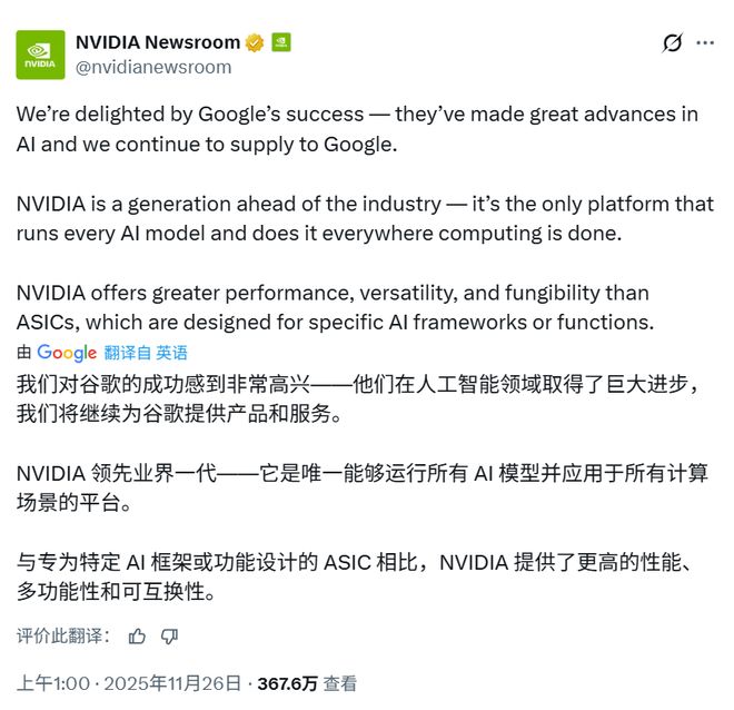 作者 |创建者:陈陈 |网易科技 “我们很高兴看到 Google 的成功,但 NVIDIA 仍然领先业界一代!”昨晚,美国股市呈现出令人惊讶的时刻:英伟达股价盘中下跌逾6%,市值跌至4.15万亿美元区间。与10月底设定的5.15万亿美元峰值相比,不到一个月的时间,这家芯片巨头总共蒸发了1万亿美元。这一说法的触发因素是科技媒体《The Information》的一篇重磅报道。报道透露,英伟达最大客户之一的 Meta 正在与谷歌进行谈判,并考虑计划从 2027 年开始将其部分 AI 基础设施迁移到谷歌自研的 TPU 芯片上,并且还可能在明年开始租赁 Google Cloud。这就像一记重锤,敲击着投资者脆弱的神经——如果连最大的金融家都想开发自己的芯片,英伟达的护城河是什么呢?还安全吗?正是前所未有的危机感迫使英伟达亲自行动。周二,NVIDIA官方账号罕见地发布了关于X平台的声明。这在过去是不可想象的——作为AI时代的绝对霸主,我们是否看到它需要急于在社交媒体上“自证清白”?这种反常的防御姿态,只会暴露万亿市值背后隐藏的巨大焦虑。相比之下,谷歌母公司Alphabet凭借备受好评的Gemi 3,股价连续第三天上涨。甚至有分析师预测,谷歌市值将很快突破4万亿美元大关,直接挑战英伟达的霸主地位。曾经看似难以逾越的“nvidia”墙似乎第一次出现了裂缝。 1、罕见的“防守姿态”:英伟达着急了吗? “我们为谷歌的成功感到高兴——他们在人工智能领域取得了巨大进步,我们将继续这是Nvidia关于X平台的声明的开头。表面上看起来充满了外交和客套话,但随后的对话却透露出这家芯片巨头的焦虑。“但Nvidia领先业界整整一代人——我们是唯一一个可以运行所有AI模型并运行在任何计算场景的平台。”对于熟悉Silicon公关言辞谷的人来说,潜台词并不难辨别。它不仅是澄清,英伟达告诉投资者和客户:不要被谷歌TPU愚弄,我们是不可替代的。英伟达感觉“摧毁脊柱”的不仅仅是谷歌的技术进步,还有GQG Partners投资组合经理、著名做空者布莱恩·科斯曼克(Brian Kersmanc)上周早些时候预测的这一时刻。非常具有破坏性的细节:谷歌最新的Gemini 3模型受到行业领袖的称赞,完全使用谷歌自己的TPU进行训练,而不是英国模型的V&D GPU。 “这与英伟达的核心叙述直接相关,”科斯曼克指出。 “Nvidia 总是声称只有他们的平台才能训练顶级模型。但今天,Gemini,也许是当今最成功的 AI 模型,也没有使用 Nvidia 卡。”如果谷歌已经证明它可以在没有 NVIDIA 的情况下开发领先的 AI,那么为什么 Meta 继续容忍 NVIDIA GPU 的高价格和生产瓶颈呢?当Meta在2027年大规模推出TPU时,不仅是损失数十亿美元订单的问题,而且还会产生多米诺骨牌效应——毕竟Meta一直是全球数据领域最激进的“烧钱大户”。致力于AI行业的博主@anyapi_ai一针见血,“黄仁勋假装轻松,股价下跌却说明投资者看到了一个印地语知名的人工智能公司”gn - 做军火商是好事,但一旦客户开始制造自己的武器,好日子就结束了。” 2、路线之战:通用 GPU vs 定制 ASIC NVIDIA 的焦虑本质上是一场关于 AI 计算未来的架构之争。近十年来,谷歌的 TPU(张量处理单元)在业界被视为“智能内部工具”:高效、快速,深度依赖于谷歌 Tensorflow 框架,但缺乏相比之下,NVIDIA的GPU(图形处理单元)是AI世界的“瑞士军刀”,垄断了超过90%的AI加速器市场。NVIDIA在周二的声明中特别强调了这一点:“NVIDIA比ASIC(专用集成电路)拥有更多的功能和更多的互换性。”Nvidia试图将TPU定义为“鲁棒”的ASIC解决方案,并将Blackwell架构描述为适应云、本地甚至边缘计算的万能钥匙。 ——黄迅也说id 在财报电话会议上表示,他很快将与 Google DeepMind 首席执行官 Demis Hassabis 取得联系,并强调“缩放法则”仍然适用——这意味着随着模型变得越来越大,对通用计算能力的需求只会增加。然而,市场趋势正在发生彻底的变化。随着AI模型逐渐从“百花齐放”走向巨头主导,专用芯片的高能效比开始显现出巨大诱惑。谷歌不仅发布了Gemini 3,还对TPU的算力给予了巨额的支持,以与Openai的anthropic相媲美。 Brokerage Seaport分析师Jay Goldberg评论道:“这不仅是一笔交易,也是对TPU的一次强有力的验证。过去很多人会思考,但现在很多人可以真正思考。”更重要的是,谷歌拥有英伟达无法比拟的“全栈优势”。从底层芯片设计,到中间云基础设施,在双子座上层模型中,谷歌控制着整个链条。这种垂直整合带来的成本和优化空间的优势,是作为“人工具”的NVIDIA所不具备的。谷歌发言人的回应似乎是“凡尔赛宫”:“谷歌云上定制TPU和NVIDIA GPU的需求都在不断增长;我们致力于支持这两者,就像我们多年来所做的那样。”翻译:我们既使用你的卡,也使用我们自己的卡,而且我们自己的卡越来越好。 3. 英伟达陷入两线作战:卖空者和巨头都在围猎它。如果说谷歌是正面战场上装备的重型坦克,那么迈克尔·伯里就是从侧翼进攻的狙击手。这位因《大空头》一书而闻名的传奇投资者最近在 Subtack 上发表了一篇针对 Nvidia 的“呐喊”文章。伯里将今天的人工智能热潮与当年的互联网泡沫进行了比较,并将英伟达与思科进行了比较,后者是互联网基础设施的硬件覆盖层,其股票价格为泡沫破灭后,大米崩溃了。 Burry的指控十分尖锐,主要集中在财务和商业模式上: ·循环融资:Burry质疑NVIDIA投资AI初创公司,然后这些公司用融资资金购买Nvidia芯片,从而增加