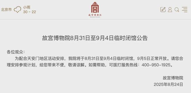 天安门地区管理委员会于2025年8月24日发布了通知。为了确保10月1日至3日,将暂停蒂安曼广场的适当安全活动,并于9月4日及时重新开放。从8月31日到9月4日,宫殿博物馆暂时关闭。根据8月24日宫殿博物馆的官方网站,该宫殿博物馆于8月31日至9月4日暂时关闭。细节如下:与Tiananmenn的地区活动合作,宫殿博物馆将于8月31日至9月4日暂时关闭,并将在9月5日暂时开放,正常从9月5日开放。资料来源:发布到北京