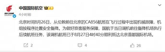 这张照片显示了8月27日中国空气中国微博帐户的屏幕截图。8月26日,北京时间,从伦敦到北京的CA856航班在飞行过程中经历了机械故障,并且员工根据方法管理安全和降落。为了提供乘客服务,中国航空公司在同一天将飞机移至备用机场,以执行随后的飞行任务。转会航班于8月27日4:40成功到达了北京首都国际机场。此前,据报道,由于机械故障,中国航空准备到达俄罗斯。 8月26日上午,一名乘客在机场折叠床上休息,北京的时间,从中国国际航空公司飞往北京的航班已准备好到达俄罗斯下瓦尔托夫斯克机场。根据有关航班的罪恶信息,该航班于8月25日离开当地时间22:43,最初于26日北京时到达首都国际机场。 but当地时间8:17,它已经准备好到达俄罗斯的下瓦尔托夫斯克机场。 8月26日,中国航空客户服务告诉红星新闻,飞行动力学表明这是机械故障,并达到了11:18(北京时间)。尚无后续信息。但是,中国航空迷你计划表明,该航班当地时间19:50从尼日尔·瓦尔托夫斯克机场(Neniger Valtovsk Airport)出发,并返回中国,预计将于27日上午3:40到达。许多乘客在8月26日由Air China Mini计划提供的飞行信息告诉Red Star News,飞机降落后,他们等待飞机数小时,然后在机场航站楼安排。机场为乘客提供折叠床,水,电线,电线等。乘客拍摄的机场录像显示,机场地面上有许多折叠床,一些乘客躺在床上休息。 PA拍摄的机场录像Sengers表明飞机飞行是波音777-39L和311个席位。根据先前的北京新闻报道,发现其中一台机器在飞行过程中无法使用。由于当地无法修复大型乘客,因此中国航空迅速做出了反应,并决定派遣一架备用飞机和技术人员携带零件到下层瓦尔托夫斯克,以接管乘客以继续旅行。