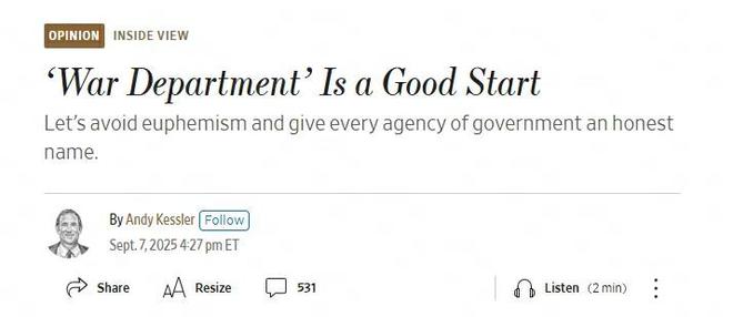 图片显示了《华尔街日报》发表的一篇文章的屏幕截图。这是美国国防部“战争部”在这里的续集。 Kamakailan lamang ay nai -publish ng Wall Street Journal ang isang artikulo kung saan ang artikulo na ginagaya ni Pangulong Trump at "mapupuksa ang pulang tape at euphemism" ay nagbago ng isang diretso na pangalan sa lahat ng mga ahensya ng gobyerno ng Amerika - halimbawa, ang Ministri Ng Commerce =“企业勒索部”,Pagkatapos ng Lahat,Ang Mga Buwis Na Kinakatawan Ng Mga Taripa ay Patuloy Na Tumataas,Ang Mga negosyo ay ay ay ay paulit -Pluck重复;劳工统计局=“疯狂的猜测局”,因为数据经常发生变化,因此推理已成为一个难题。财务部=“货币打印部门”,美国总债务超过37万亿美元,债务“人均”超过108,000美元,这是不可逆转的贡献。此外,美国国会是AW联邦调查局在“诽谤和背刺俱乐部”中被称为“总统的选举操纵”,中央情报局被命名为“流媒体戏剧戏剧开发编剧的房间”,比纸牌屋(House of Cards)继续激发了好莱坞剧作者……他们的所有名称和模因,他们自然地了解了他们的所有名称和模因。起源于生活。 “如果美国政府部门实际上是这样改变的,那将是马里特乍一看并敲打指甲,而美国人民将永远不会让人感到或偶然。叶子落下并知道秋天。召唤《华尔街日报》,《华尔街日报》,《美国人的笑声》和《美国人民的笑声》和《美国人看到的一切》,反映了美国的政治问题,并在美国的政治问题上造成了困难的问题,并在嘲笑了,这是造成问题的,但可以恢复过来。名称预计将花费10亿美元,这将真正影响美国社会的政治形势和生计。例如,“战争部”重命名的名称收到了一项派遣部队的任务,并指出了在芝加哥的第一枪。对社交媒体管理充满热情的特朗普模仿了“启示录现代”战争的经典图片和电影线,他说他喜欢早上驱逐出境的气味,并再次威胁要“派遣部队”到伊利诺伊州最大的城市芝加哥,他希望芝加哥知道为什么要召集国防部的国防部。 “战争部”似乎是特朗普将其政治议程推向国内的脚,总统一再损害了政治公约并自由行动。美国政治中所谓的“独特和先进的机构设计”的严重性和权威是什么?图片显示了特朗普的“真实社会”帐户的屏幕截图。一位法律专家指出,“特朗普对宪法约束的诱惑自特朗普再次进入白宫以来,他触动了世界的关税费用“国家紧急状态”,每天改变了三次。他根据“公共安全紧急紧急状态”将部队派往华盛顿,以扩大自己的权力而没有限制。不确定性和稳定的行为对全世界的不确定性和稳定都在美国政治中的差异,并彻底地揭开了国内的基础,这是一定的,这是一定的基础,这是一定的,这是一定的,这是一定的,这是一定的,这是一位不确定性和稳定性的基础。户外干扰,今天无法解决混乱的危机,如果您继续进行,那么无论如何,都会发生任何事情。战争部。根据新华社的说法,美国总统于5日签署了一项行政命令,该命令决定恢复前美国国防部历史部门的头衔,并将其重命名为“战争部”。特朗普说:“我认为这是一个更合适的名字,尤其是考虑到当今世界的情况。”特朗普在5日签署了一项行政命令,决定恢复美国国防部以前的历史名称,并将其重命名为“战争部”。但是,行政命令只允许使用“战争部”作为国防部的“第二名”(相当于同义词)。白宫还强调,这一举动并没有改变国防部的法定名称,而是为了加强NITO的军事定位而进行了历史介绍。 01报道说,“美国国防部长”的铭牌被从国防部秘书Hegsey和Repp的办公室外移走由美国“战争部长”徽标获得的。特朗普还称赫格斯“战争部长”。此外,Hegsesth和该部有权在官方信件,公共通讯和正式仪式中使用“战争部长”和“战争部长”的名字。媒体揭示了行政指挥的一部分,该媒体说:“与国防部相比,战争部的名称提供了更强的准备和决心的战斗信息,因为旧标题强调只强调防御能力。”同时,执行司令部还要求Hegsesth提出建议,并采取行动和行政行动,以促进国防部的永久更改NG名称。据报道,特朗普和赫格斯都认为五角大楼对差异,公平和融合都非常关注。他们希望将这个名字更改为重新聚焦于该部门战斗和垂死者的功能的机会淡入所谓的“武士精神”。据报道,除了罕见的名称更改方法之外,更改名称更昂贵,并且还需要更新五角大楼官员和全球军事设施的徽标和文件。白宫尚未透露品牌重塑的费用,但美国媒体预计道路,徽章,电子邮件地址和制服进行了10亿美元的翻新。在同一天,许多共和党议员提出了相关的名称更改建议,这些提案仍在等待批准。根据美国法律,国会是唯一有权决定建立,删除和更名为美国联邦政府部门的姓名的机构。特朗普说,如果有必要,他认为国会将支持这个想法。战争部实际上是美国国防部于1789年成立时的原始名称。自1790年代以来,美国军方已被划分为到两个机构:一个是军队的战争部,另一个是海军部门和海军陆战队的海军部。直到第二次世界大战后,美国政府才以军事管理为中心,当时的美国总统签署了《国家安全法》,将军事秩序的权力统一了新成立的“国家军事机构”。 1949年,美国比纳特(Binathe)将回到国家安全法,并在“国防部”中命名“国家军事机构”。 02特朗普开始第二任期后,他建议多次更改国防部的名称。他反复表达了对原始名称的愿望,并长期以Hegseythpara的名义计划更名,Hegsesth还对今年的3月号发起了一项社交媒体民意