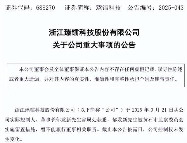 9月21日晚上,Zhenlei Technology发布了“公司专业事务的宣布”,称该公司的实际镇压和主席Yu Faxin被Huangshi Municipal监督委员会拘留,并且当时没有履行公司董事的相关职责。图片显示了公司发布的公告的屏幕截图。公共信息表明,Yu Faxin于1975年出生,曾在2006年1月以来曾在Zhejiang University的航空和宇航学院担任教授。近9月19日,Zhenlai的股票价格为每份69.50元,下跌2.65%,总市场价值为1488亿元。 6月30日,公司股东为12200。图片显示了Zhenlai Zhenlai技术股价的价格:Zhenlai Technology不会对正常的NA公司运营产生重大影响,Zhenlai Technology宣布该公司将继续根据“公司法”,S,康复和创新委员会的股票清单规则“以及其他相关法律,法规以及与阶级系统”。日至日期运营和管理是公司高级管理人员的责任,该公司为任务做了一个适当的组织。公司拥有完整的管理结构和内部控制机制。内部控制机构。公司董事的董事会主持人正常工作。高级管理人员正常履行其职责,其子公司将有正常的生产和运营条件,并且该公司表示,由于该公告的披露日期,该公司不会对公司的正常运营产生重大影响。纽带,公司不知道拘留调查的发展和结论。公司将继续关注上述物体的后续情况,并立即履行信息的强制性披露并提醒相关风险。根据该公司的官方网站,Zhenlei Technology成立于2015年9月,致力于终端RF前端芯片,高密度包装的微波模块和微型系统。它是设计,开发,劳动力和销售的私人高科技企业集成。目前,这是一个全国性的高科技,也是高科技企业研发中心的省。该公司的RF前端芯片包括终端功率放大器,终端低噪声放大器,终端RF开关等,并且可以在无线通信终端字段中广泛使用,例如临时网络,无线电站,数字对讲机和航海。可以使用微型系统和模块在各种分阶段的阵列负载系统上,例如卫星,地面,车辆和船只。该公司已成为国内行业通信和雷达领域中RF芯片,微型系统和模块的主要供应商之一。在绩效方面,Zhenlei技术在上半年获得了2.05亿元的营业收入,同比增长73.64%。与股东相关的净利润为623.17亿元人民币,增加了1006.99%的年度;每个部分的基本收入为0.29元。去年税前的Yu Faxin的年薪为960,000元,一位联合演员只减少了他的持股量,并释放了4.44亿元人民币。根据2024年Zhenlai技术的年度报告,Yu Faxin出生于1975年3月,有中国国籍,在国外没有永久性的家庭,医生学位,教授。从1997年9月到1999年6月,他在哈尔滨技术研究所学习通信和信息系统硕士学位y;从2000年3月到2002年6月,他在哈尔滨理工学院学习了通信和信息系统。从2002年6月到2005年12月,他曾在UT Starkang Company担任高级研发工程师;从2006年1月到现在,他成为郑大学航空和宇航学院的教授。从2017年5月到现在,他担任公司的董事,自股份公司已维修以来,他一直担任该公司的董事长。图显示了Yu Faxin的数据图。她目前是惠东大学航空和宇航学院的教授。照片/Zhenle Technology官方网站于2024年,Yu Faxin从公司获得了960,800元的税前工资。从公司获得的税前薪酬YU FAXIN为RMB 960,800。 2025年的半年度报告显示,在报告期结束时,Yu Faxin由约4500万股持有,股份有股份。O 21.04%。基于每部分69.5元的第17个-Zhenlai技术共享价格,Yufaxin的股权市场价值约为31亿元人民币。图片显示了一份半年前的屏幕截图报告。值得注意的是,Zhenlai Technology于9月4日晚上宣布,该公司对Yu Faxin,Chenxin Investment,Zhenlei Investment和Ruilei Investment的实际控制,通过转移移动将其持股量减少了830.52亿股份,为53.52元。变更此权益之后,Yu Faxin和他的联合演员将公司的股份从32.62%到28.74%,公司股权的变化达到了数量5%的整数。根据计算,Zhenlai Technology的三名股东此时发布了约4.44亿元人民币。资料来源:Nancai Express的21世纪商业先驱