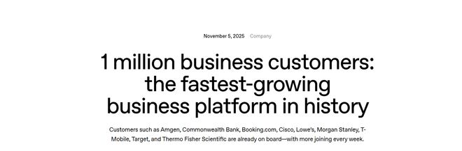 财经新闻网11月6日电(编辑石正成)作为美国股市上涨的焦点,明星公司OpenAi周三宣布,全球有100万家公司正在直接使用该公司的服务。公告称,统计范围包括所有主动付费商用的组织,以及通过开发者平台直接消费该模型的商家。该公司此前于9月初披露,包括ChATGPT Enterprise和Chatgpt Edu校园版用户在内的用户数量已超过100万。 。该公司宣布,目前ChatGPT上用于工作的商业用户席位数已超过700万。 Openai COO Brad Lightcap 此前在 8 月份透露,当时的座位数仅超过 500 万个。也就是说,AI龙头的付费B端业务在短短两个月内增长了40%。其中,ChatGPT Enterprise席位增加9倍同比。为了促进企业购买服务,OpenAi今年推出了一系列针对办公环境的工具,包括可以整合“美国钉钉”Slack、谷歌云盘、GitHub数据进行推理的“企业知识库”,还提供了针对企业协作环境优化的GPT-5版本。 OpenAI 还透露,用于代码生成、重构和工作流程自动化的 Codex 模型的采用率最近有所提高,自 8 月份以来使用量增加了 10 倍。 Openai 表示,思科已将 Codex 引入其开发流程,并将代码审核时间缩短了 50%。其他“典型用户案例”还包括知名投资机构凯雷集团。 Ayon kay Openai、pinaikling ni Carlyle 和 oras ng pag-unlad ng multi-ahente na nararapat na balangkas ng sipag ng higit sa 50% sa pamamagitan ng AgentKit、ang pinakawalan na platform ng konstruksyon ng ahente ng negosyo, at nadagdagan ang k阿瓦斯图汉·阿亨特·30%。 Si Fidji Simo,生态系统首席执行官,应用程序和 kumpanya, ay nagsabi na ang pinakamatagumpay na kumpanya ay gutagamit ng AI upang lumago nang malaki,印地语 lamang gupitin 和 mgagastos。他们更快地推出新产品,并致力于研究过去记录的许多好想法。 Sinabi 在 OpenAi 中提供了 pagbiling mga serbisyo ng AI,在 Maraming mga kumpanya 和 sumali 中提供了 ChatGPT 生态系统。 Figma 和 Spotify 等公司的应用程序直接连接到 ChATGPT,沃尔玛、PayPal 和 Shopify 等 ku 公司也通过 Chatgpt 业务协议直接向人工智能工具用户提供购物选项。 OpenAI 在 9 月份推出了 Instant Checkout,允许用户无需离开聊天窗口即可完成购买。 Chatgpt 从通过其网站进行的每笔交易中收取少量佣金。该公司告诉投资者,由于大多数chaLaban的背景是TGPT用户不付费预计从2026年到2030年,非付费用户产生的商业收入将带来1100亿美元的收入。